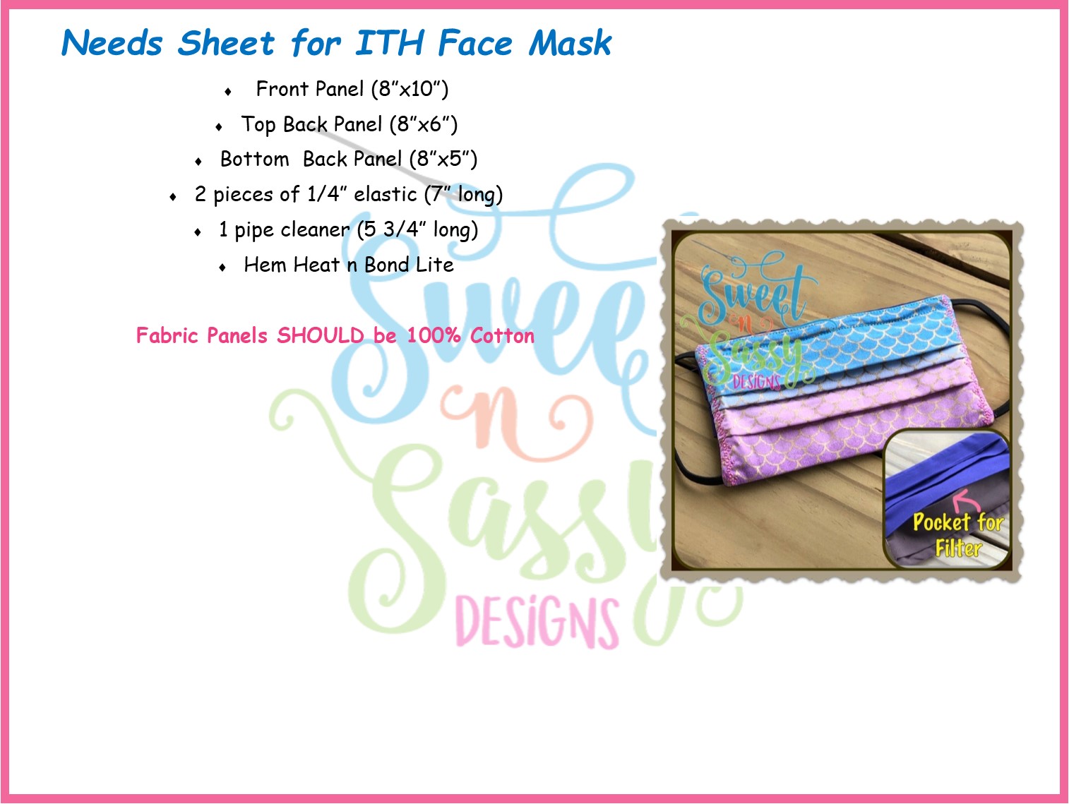 This listing includes the ITH Face Mask Embroidery Design for the 4×4, 5×7 and 6×10 hoop sizes. The 4×4 hoop size is for the 18″ doll, while the 5×7 hoop sizes include design for adult and child. The 6×10 is a larger adult design. Also included is teh 5×7 adult design as a double for increased production. This is not a finished product, but only the digitized designs. Any photos of finished products associated with this post are for inspiration purposes only.