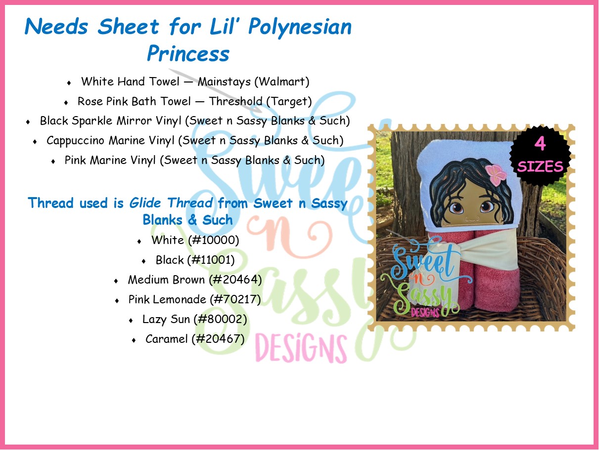 This listing includes the Lil’ Polynesian Princess Embroidery Design. This is not a finished product, but only the digitized designs. Any photos of finished products associated with this post are for inspiration purposes only.