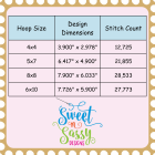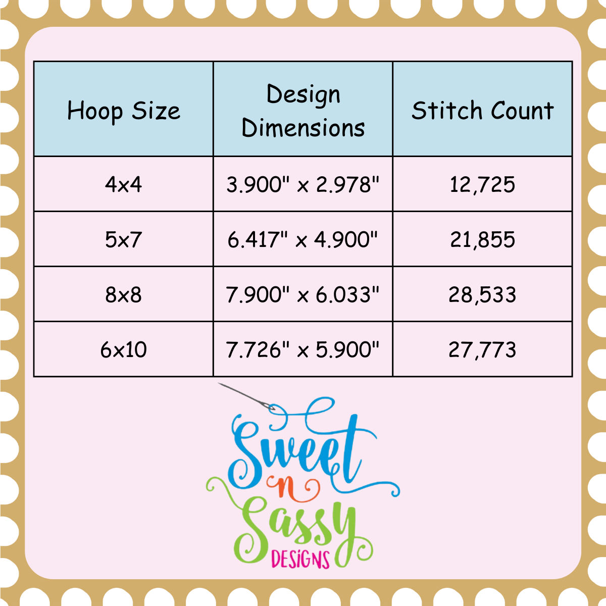 The zipped file includes files for 4×4, 5×7, 8×8, & 6×10 hoops, SVG Cut Files for all hoop sizes, and and a color layout (sequence chart), with the following formats:
