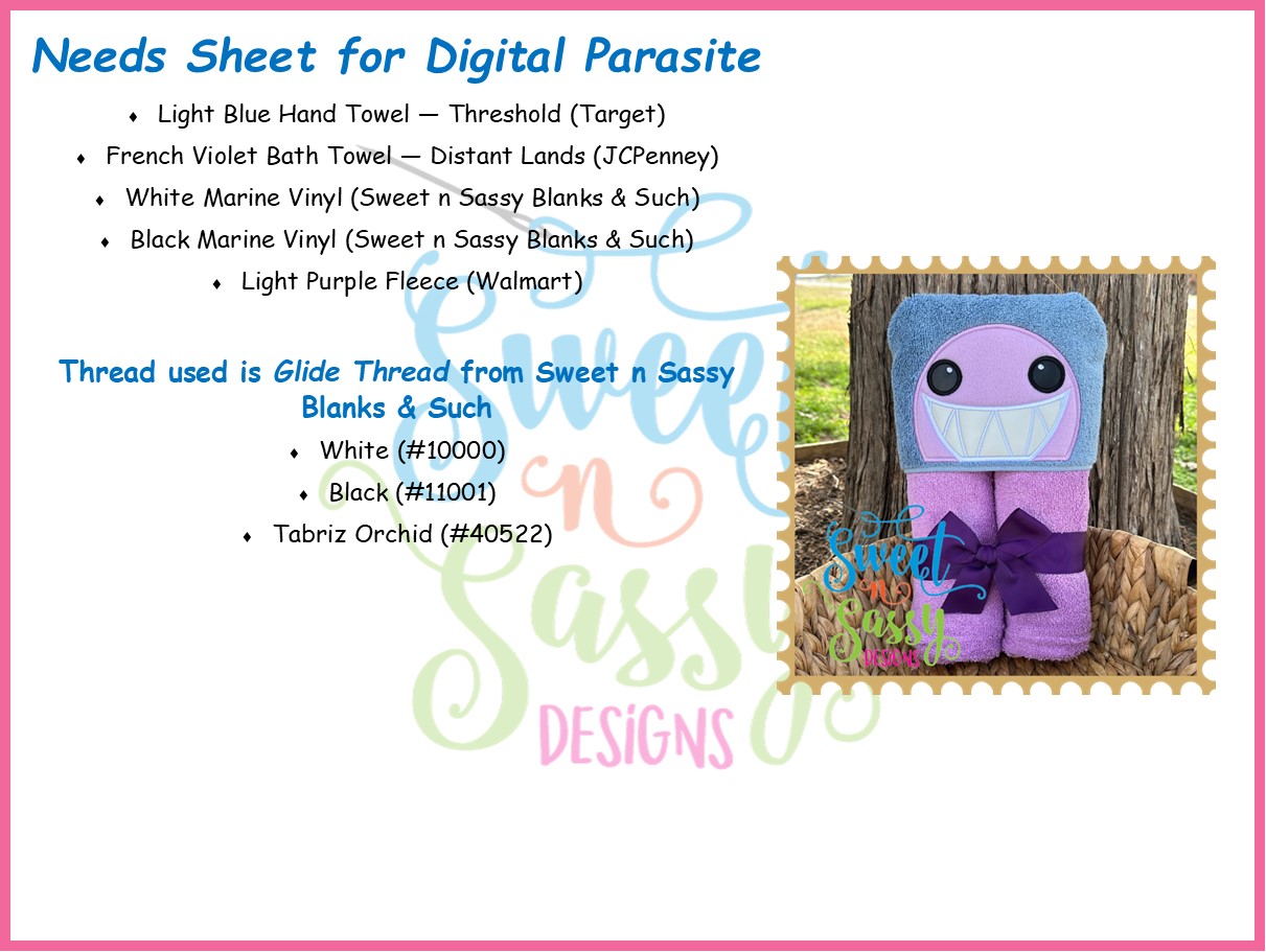 This listing includes the Digital Parasite Embroidery Design. This is not a finished product, but only the digitized designs. Any photos of finished products associated with this post are for inspiration purposes only.
