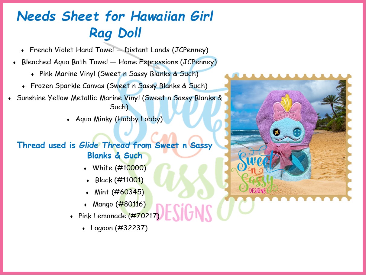 This listing includes the Hawaiian Girl Rag Doll Embroidery Design with its coordinating add-on design. This is not a finished product, but only the digitized designs. Any photos of finished products associated with this post are for inspiration purposes only.