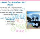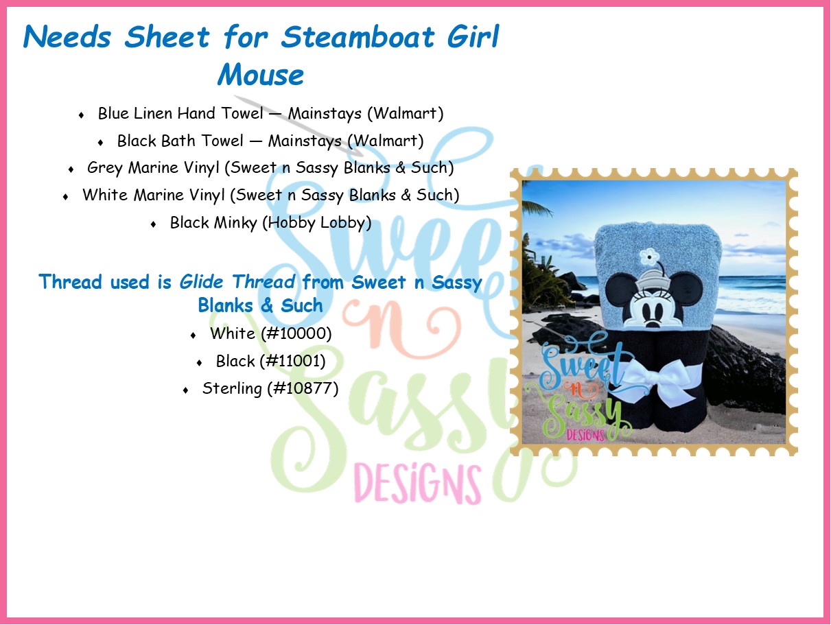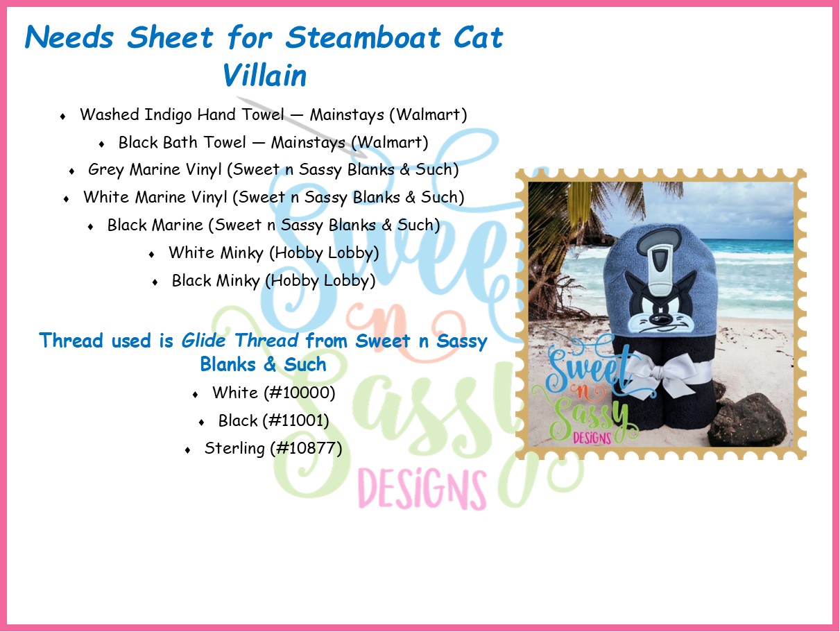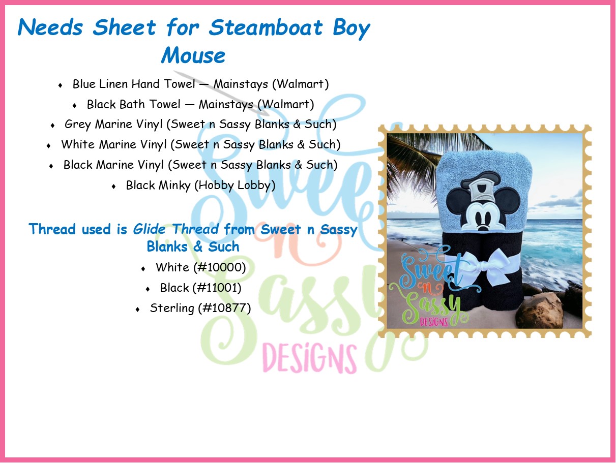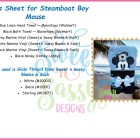 This listing includes the Steamboat Boy Mouse, Steamboat Girl Mouse, & Steamboat Cat Villain Embroidery Designs. This is not a finished product, but only the digitized designs. Any photos of finished products associated with this post are for inspiration purposes only.